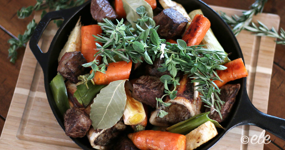 - Once your vegetables and bones have roasted, pull them out of the oven and put them directly into a crock pot. Add the braised meat and herb bundle into the crockpot with the bones and veggies.